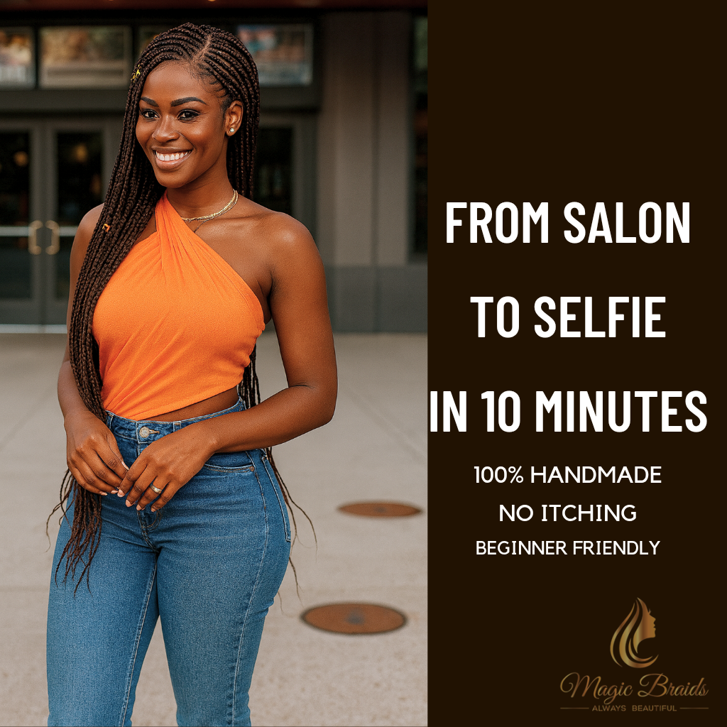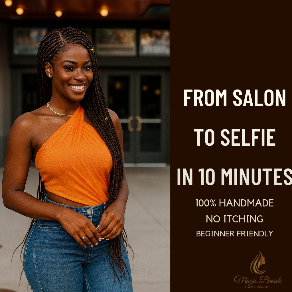 In a world of symmetry, true beauty often lies in deliberate imbalance. The Asymmetric Elegance is crafted for the woman who writes her own rules and wears her confidence as her boldest accessory. One side showcases sleek, sculpted braids that trace your scalp with architectural precision, while the other cascades into beautiful, flowing box braids that move with effortless grace. This masterful contrast isn’t just a style—it’s wearable art that creates dimension, movement, and undeniable presence. Whether you’re creating captivating content, attending fashion-forward events, or simply expressing your unique perspective, this jet black masterpiece delivers runway-ready sophistication without demanding salon hours. Slip it on in 10 minutes and step into spaces where your style speaks first and loudest.