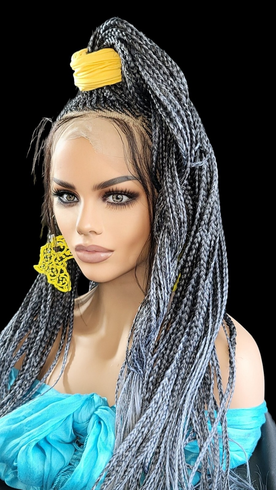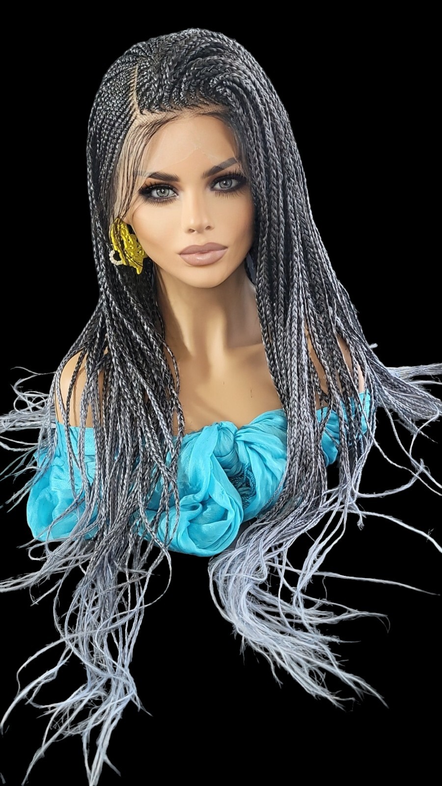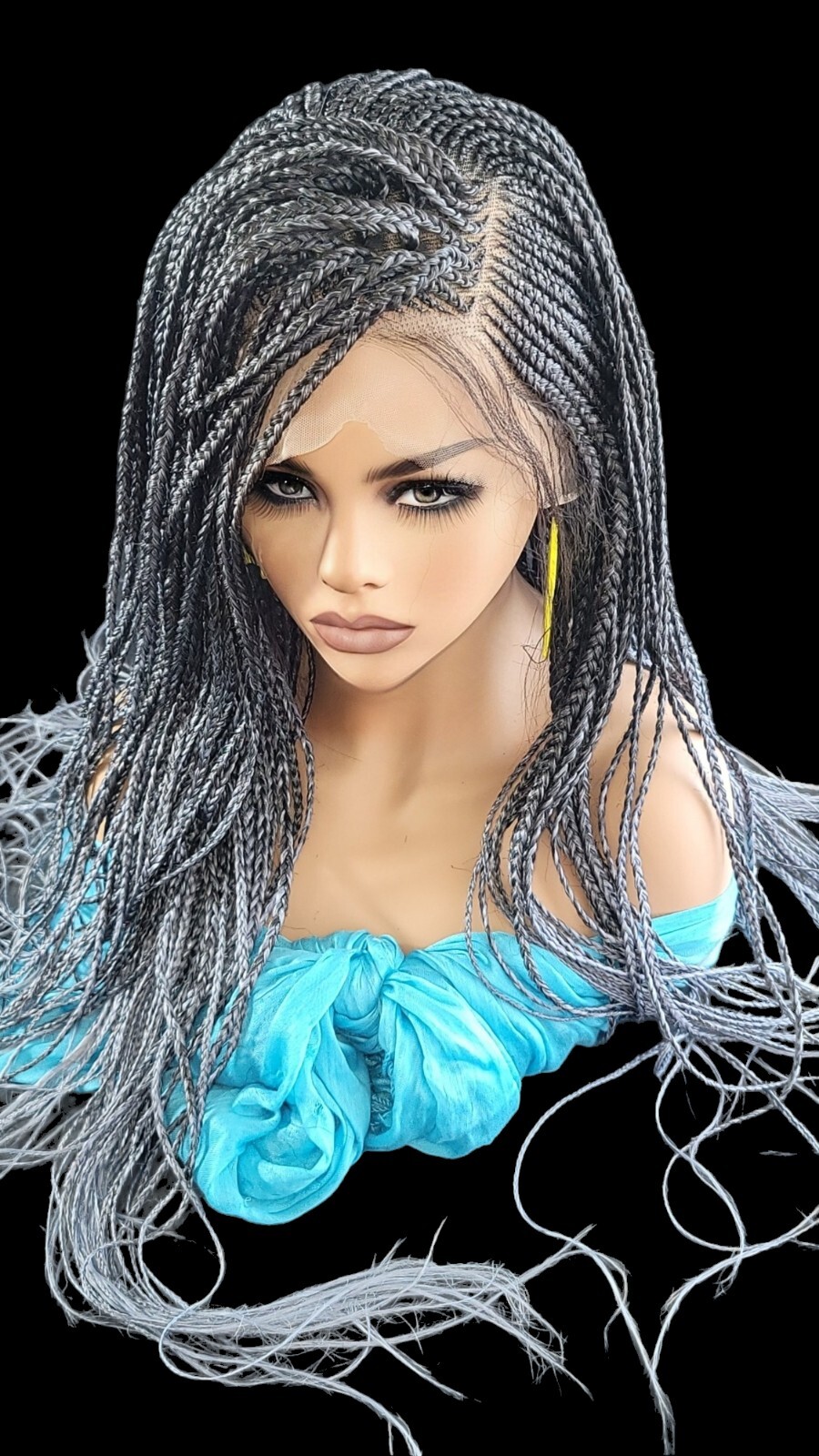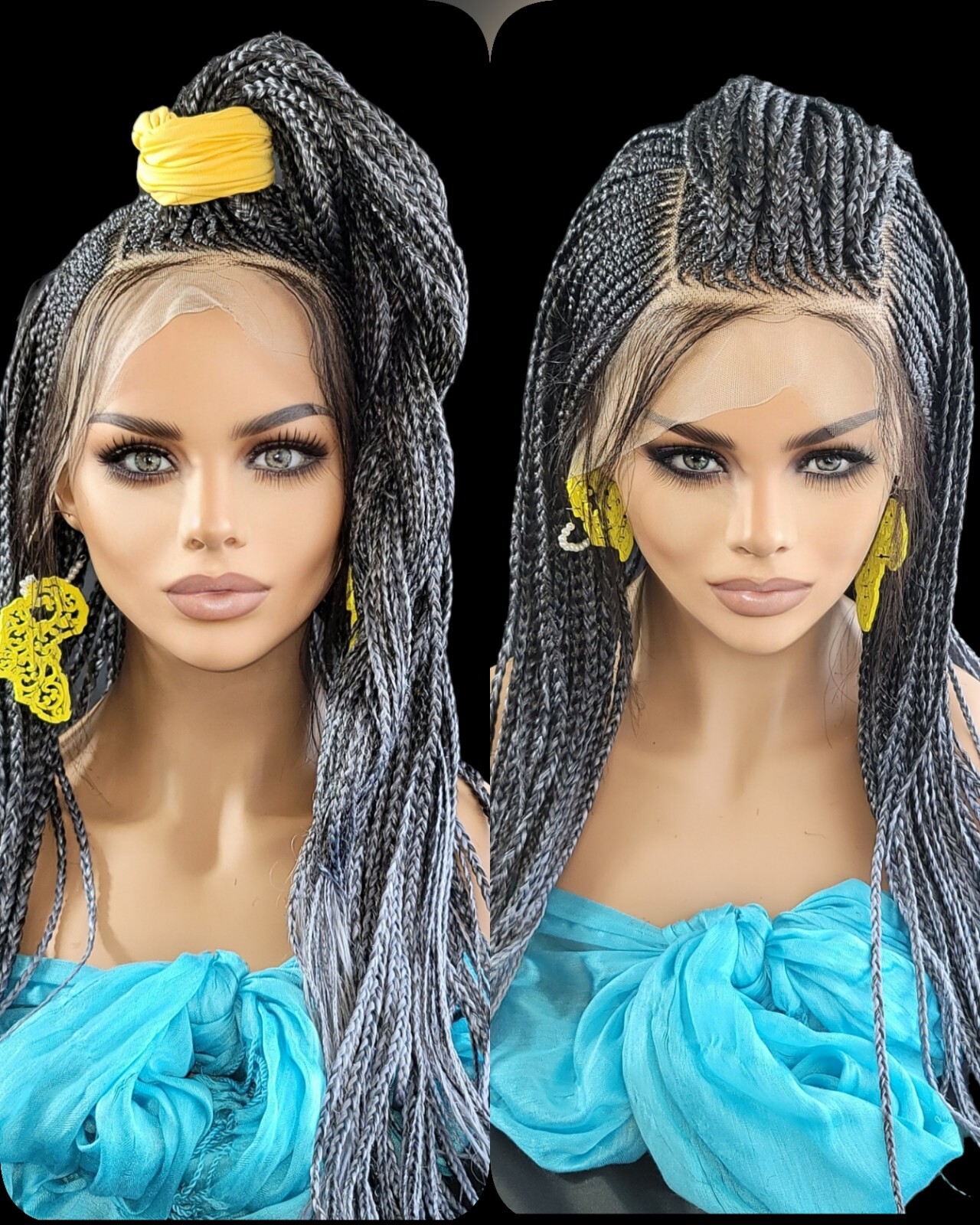 When color becomes art and style becomes statement,you’ve found The Silver Spectrum. This isn’t just a wig—it’s a style laboratory where modern design meets wearable artistry. The exotic silver ombre transitions like liquid metal, while the innovative blend of medium feed-in cornrows and box braids creates a pattern play that demands a second look. At 28 inches of versatile length, it transforms with your creativity: flip the box braids aside for striking side cornrows, or gather it into an edgy bun that reveals intricate patterns. Wear it with the simplest shirt, and watch as every eye follows the color journey, every camera focuses on the architectural design, every conversation starts with “Your hair is gorgeous.”