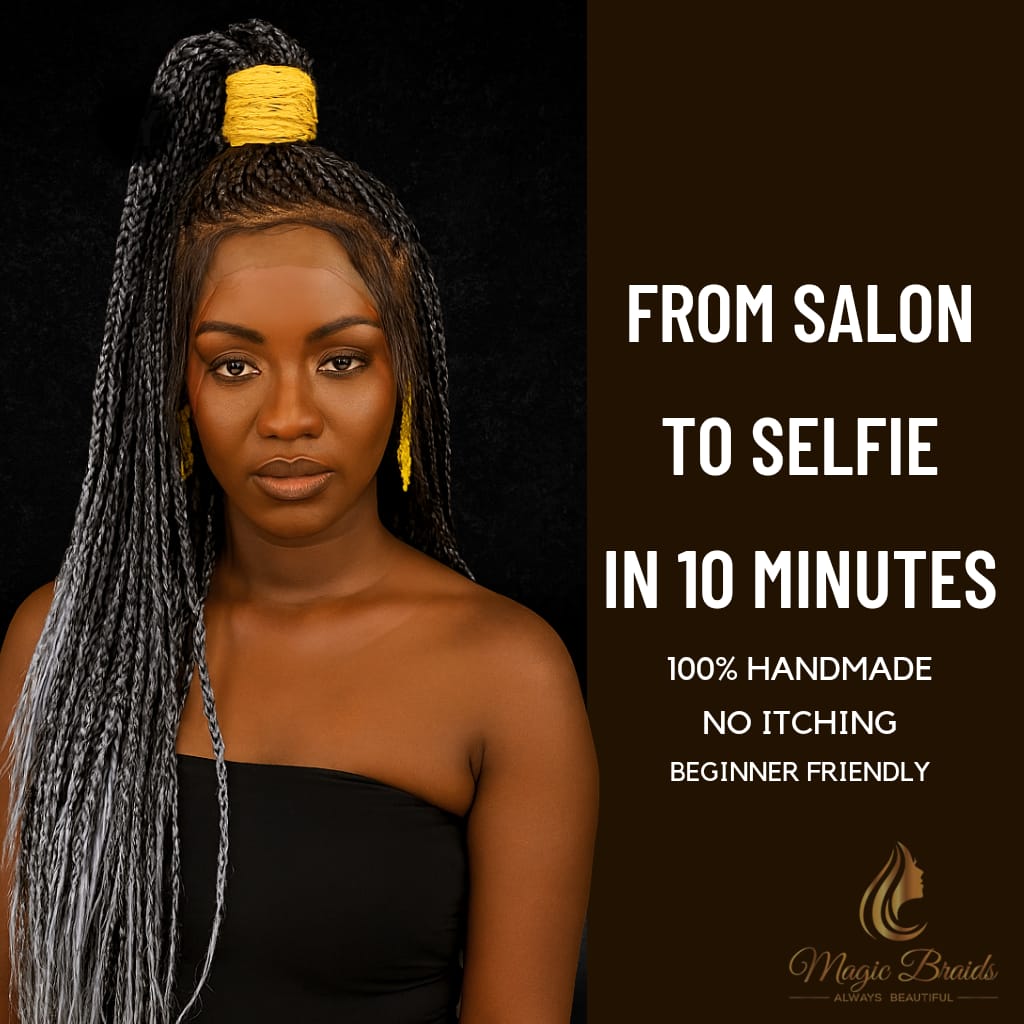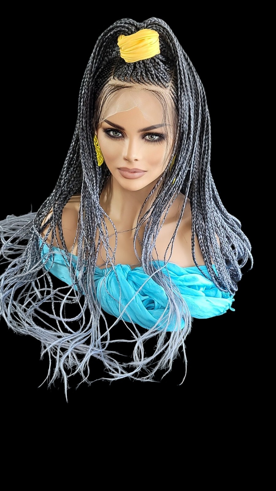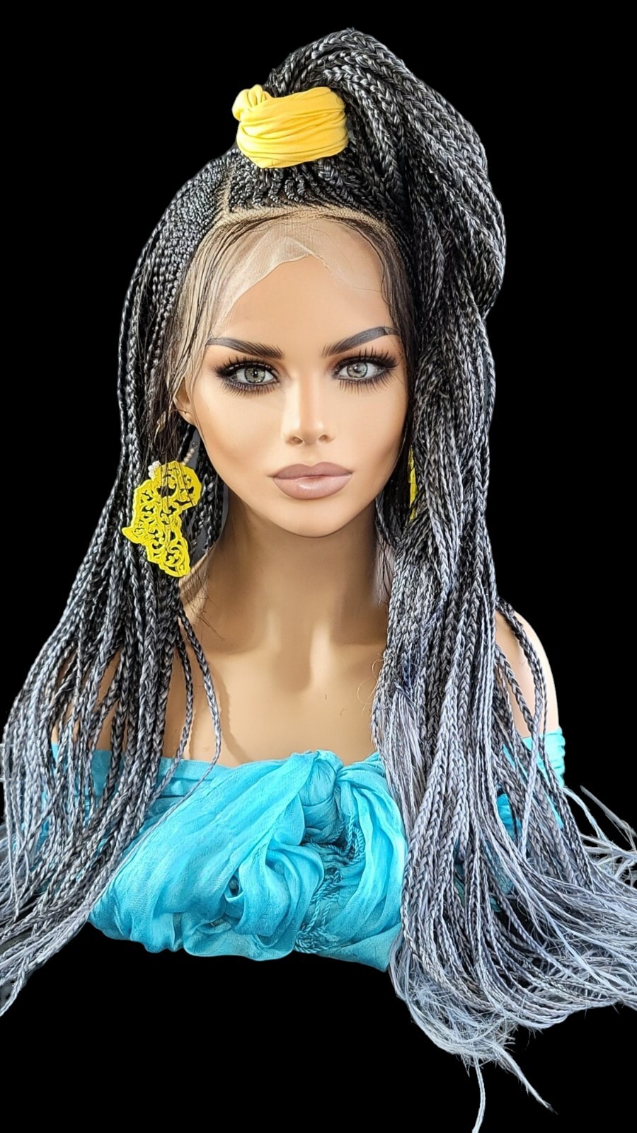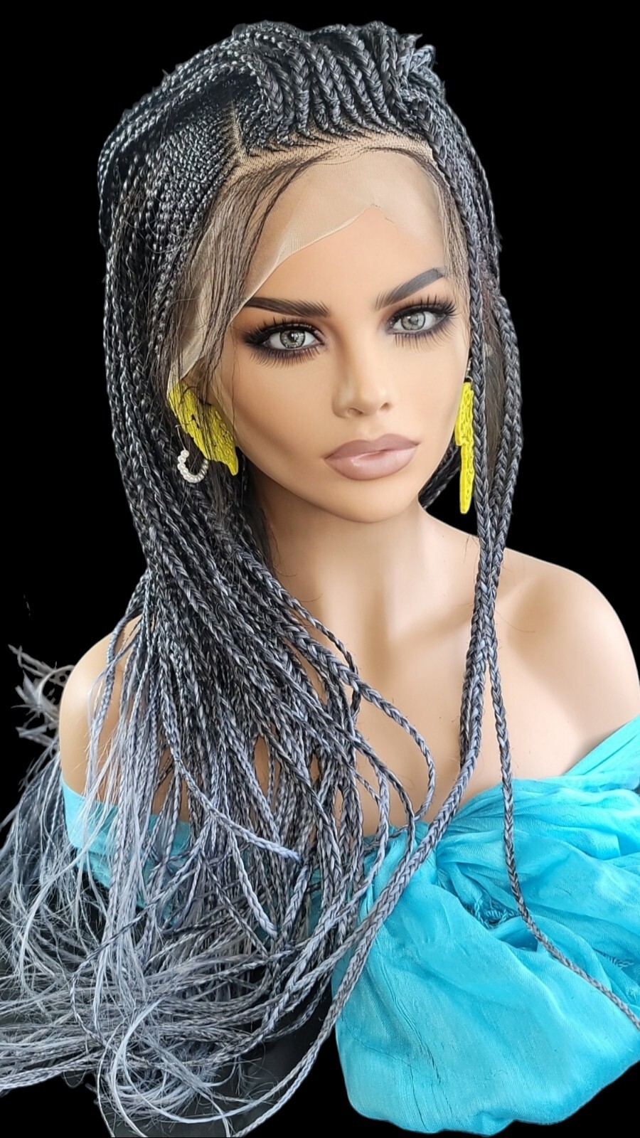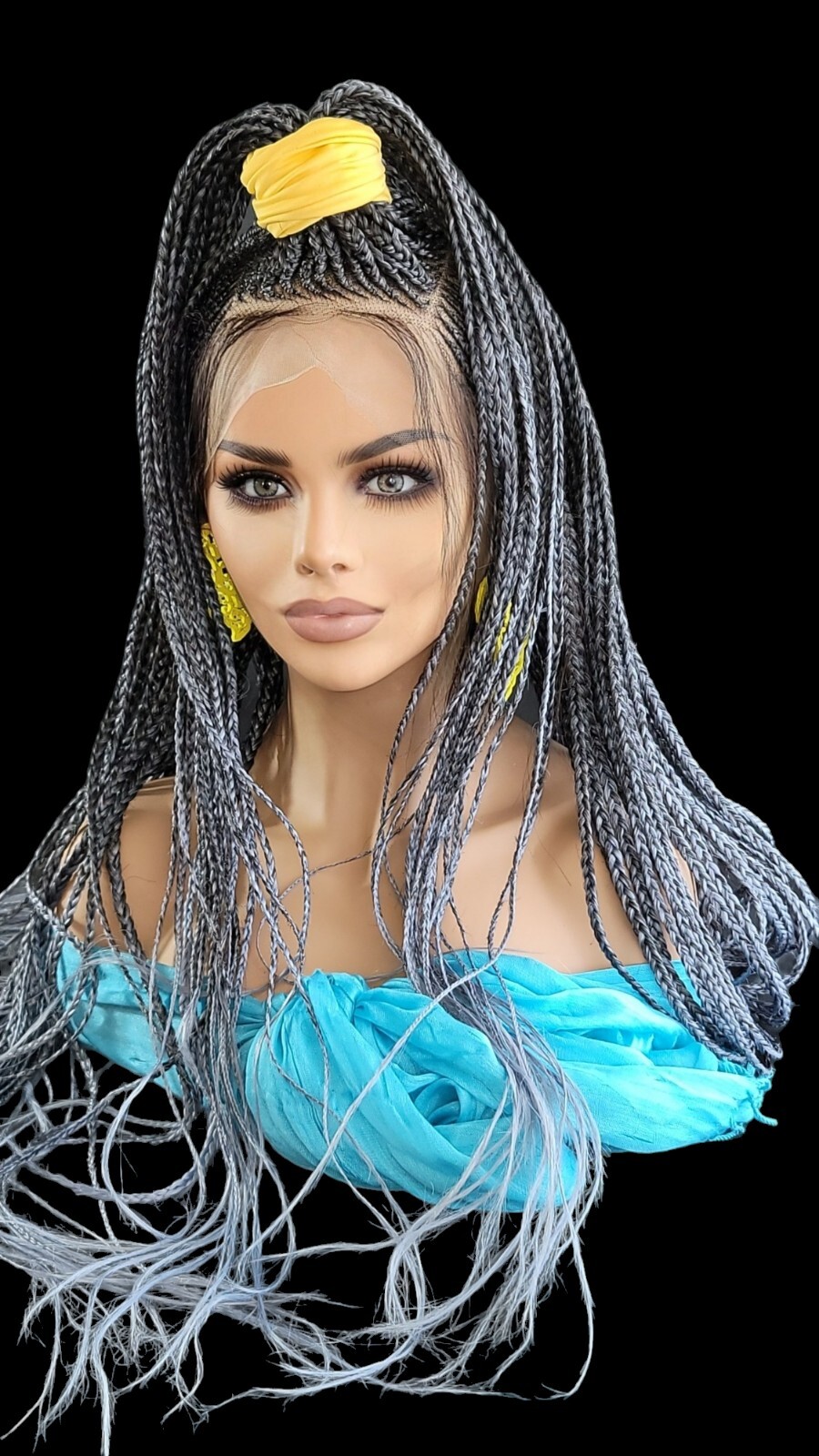 When color becomes art and style becomes statement,you’ve found The Silver Spectrum. This isn’t just a wig—it’s a style laboratory where modern design meets wearable artistry. The exotic silver ombre transitions like liquid metal, while the innovative blend of medium feed-in cornrows and box braids creates a pattern play that demands a second look. At 28 inches of versatile length, it transforms with your creativity: flip the box braids aside for striking side cornrows, or gather it into an edgy bun that reveals intricate patterns. Wear it with the simplest shirt, and watch as every eye follows the color journey, every camera focuses on the architectural design, every conversation starts with “Your hair is gorgeous.”